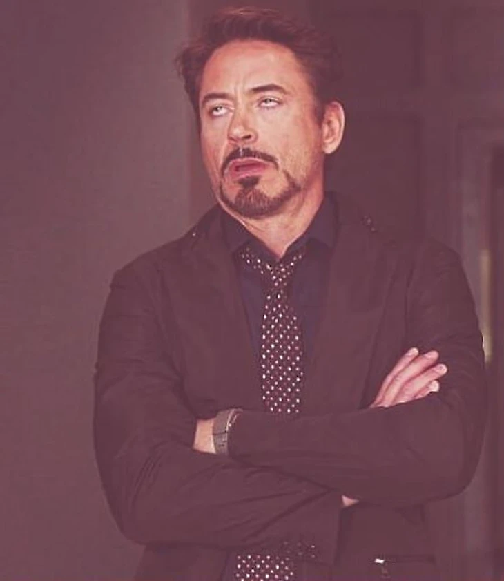 Этот мем получился из скриншота «Мстителей», вышедших в 2012 году. На нем Тони Старк закатывает глаза во время совещания примерно на 55-й минуте фильма. Обычно его распространяли с подписью «Твое лицо, когда...», но вскоре сократили, ведь по нему и так понятно без пояснений.