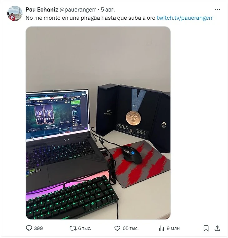 23-летний баск 1 августа завоевал бронзу в гребном слаломе. После соревнований он вернулся в Олимпийскую деревню, но вместо отдыха сел за ноутбук и отправился в ранговую игру LoL. Соответствующий анонс с фото, на котором есть и медаль, собрал миллионы просмотров в соцсети X (бывший Twitter).