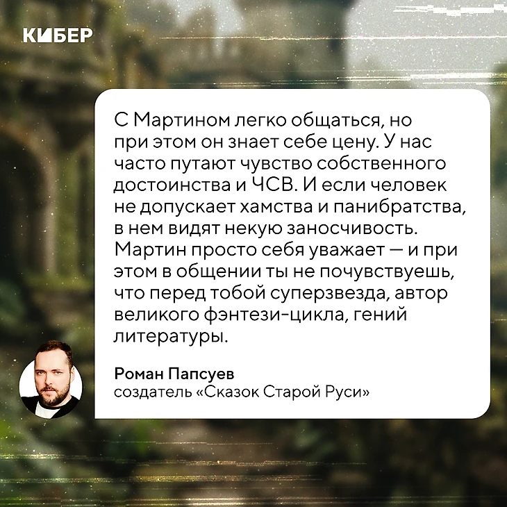 – Очень прикольный дядька. С ним легко общаться, но при этом он знает себе цену. У нас часто путают чувство собственного достоинства и ЧСВ. И если человек не допускает хамства и панибратства, в нем видят некую заносчивость. Мартин просто себя уважает – и при этом в общении ты не почувствуешь, что перед тобой суперзвезда, автор великого фэнтези-цикла, гений литературы.