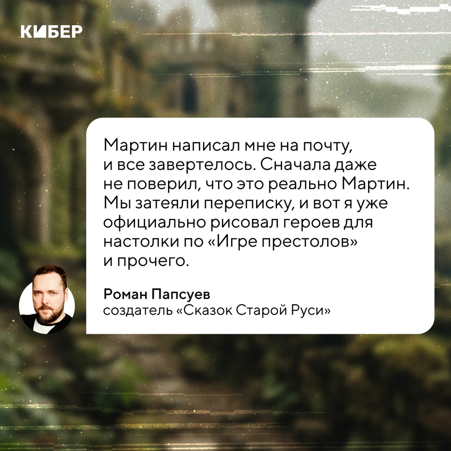 В рамках Кибер Феста я пообщался с Романом Папсуевым. Обсудили характер Джорджа Мартина, недавнюю игру и будущее «Сказок Старой Руси».