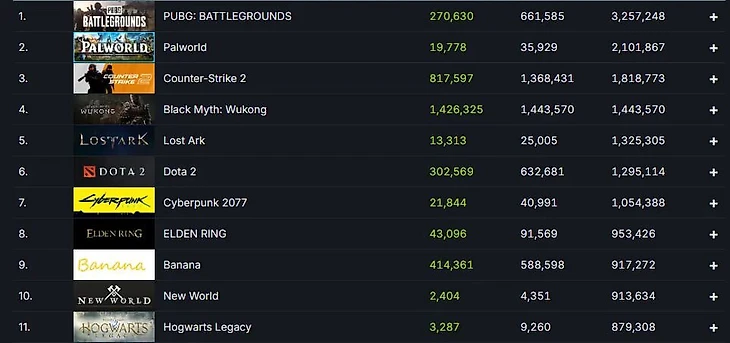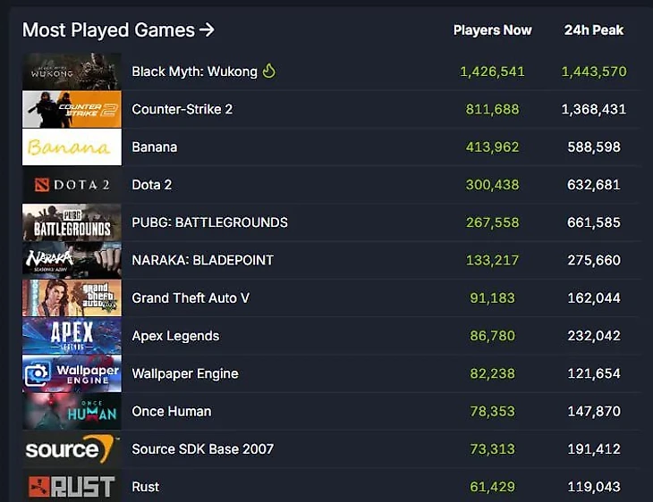 Более того, среди всех игр Black Myth: Wukong – четвертая по пиковому онлайну. Мощнее пики были только у PUBG, Palworld и CS 2.