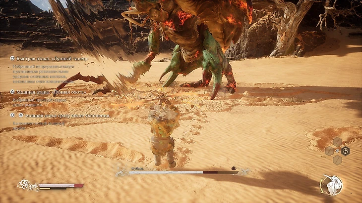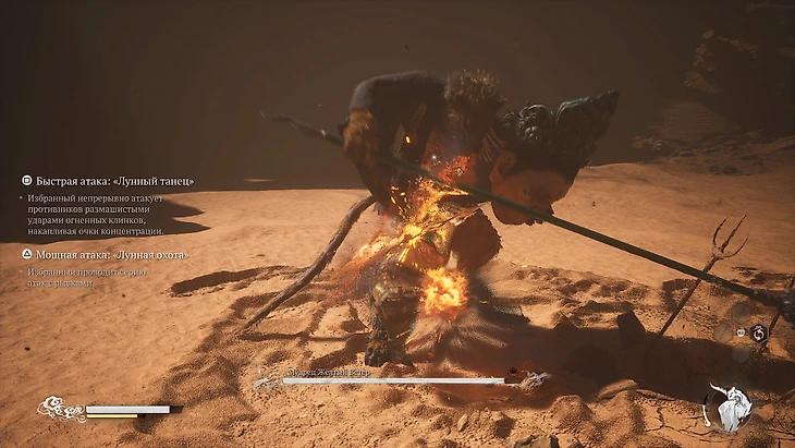 В начале игры вы одолеете мага огня и научитесь превращаться в него. У духа отдельная полоска здоровья. Когда она иссякнет, вы снова станете обезьяной. Способность долго перезаряжается, так что примените ее в начале боссфайта. Если драка затянется, активируете духа повторно и упростите жизнь.