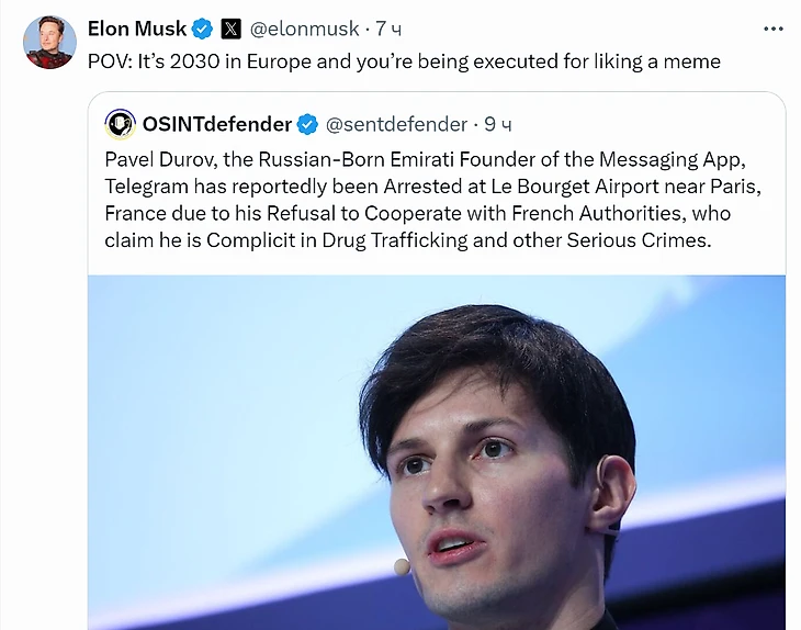 Илон Маск сразу же поддержал Павла Дурова в соцсетях: «Представьте, 2030 год, в Европе вас казнят за то, что вы лайкнули мем».