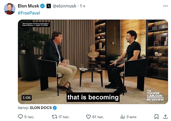 Также Маск запустил особый тег, который призывает освободить Павла Дурова: