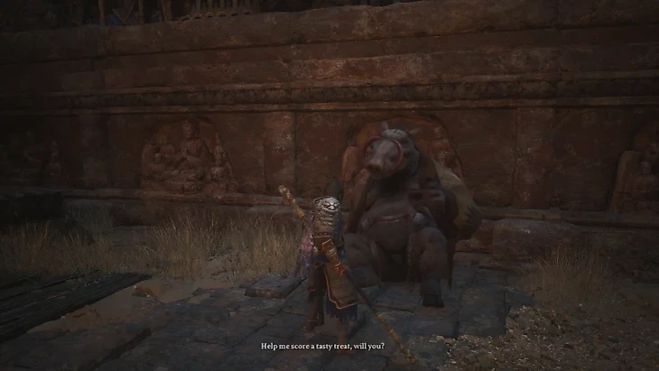 От святилища у входа в храм идите вверх по лестнице. Не доходя до самого верха, поверните направо. Там вы увидите кабана, который стоит у стены.