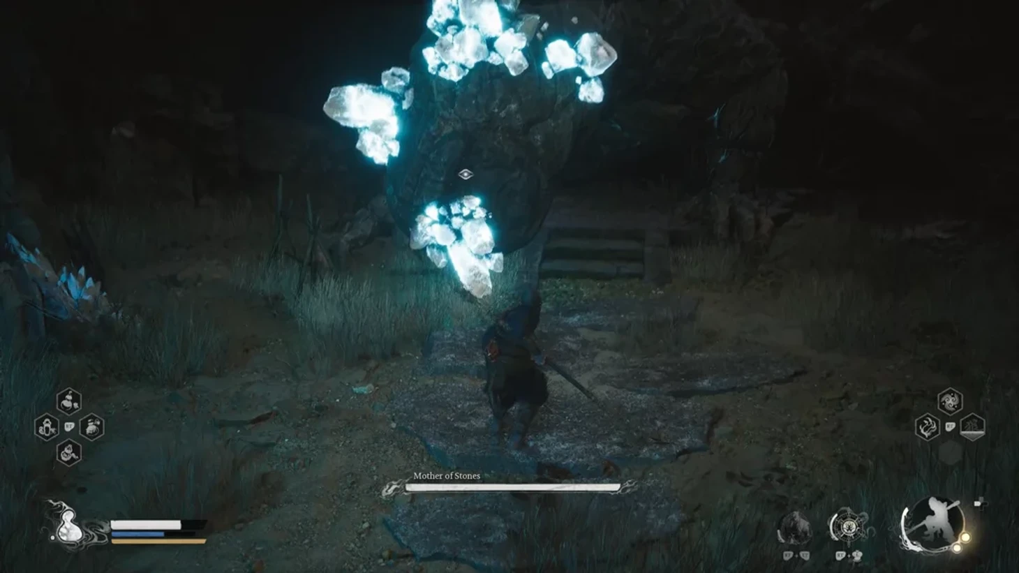 Чтобы ему помочь, нужно одолеть босса по имени Мать Камней. Ее можно найти на лестнице слева, прямо перед святилищем Хранителя Каменистой Равнины. Когда победите Мать Камней, получите важный предмет – Эссенцию Камня. Ее нужно отдать Человеку-в-Камне.