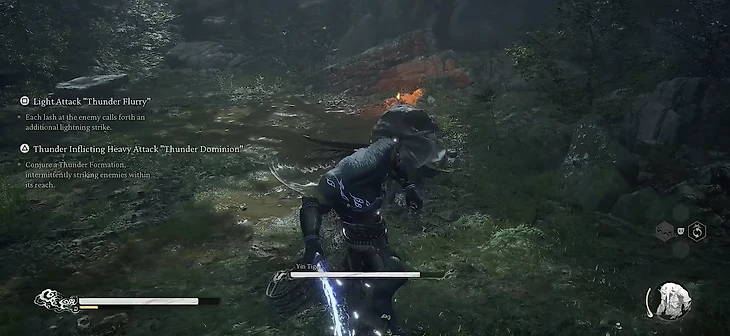 Заклинание «Молниеносное вливание» – можно выполнить только с полным фокусом, Поднимите хлыст к небу, позволяя грому проникать в вас через него, заряжая вас энергией. Также меняет легкую и тяжелую атаку.