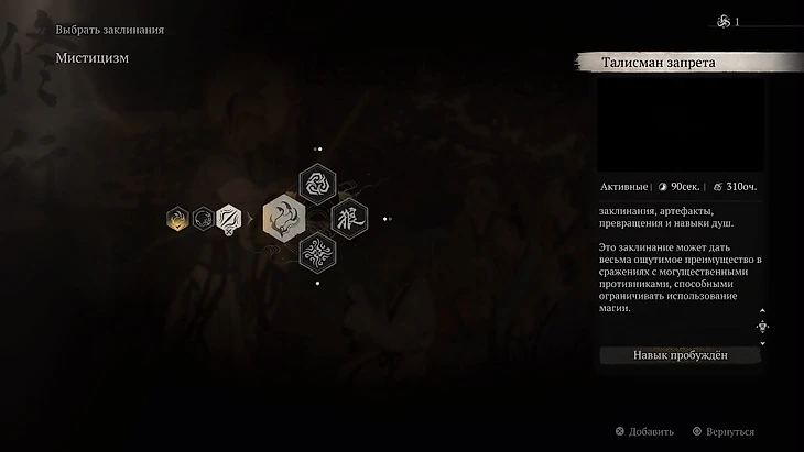 Это заклинание запрещает любую магию, зато значительно усиливает удары. В третьей главе полно боссов-монахов, которые уворачиваются от заклинаний и ударов в перевоплощенной форме. Зато выпады, усиленные Талисманом запрета, дойдут до цели.