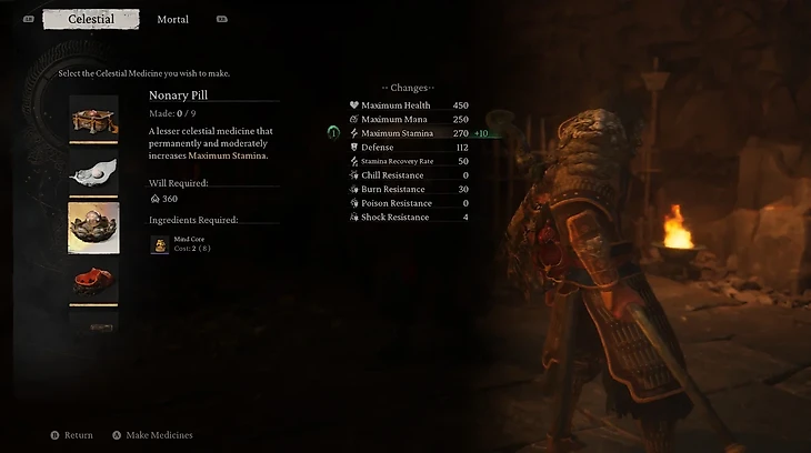Встретив Xu-Dog после исследования Подвала Храма Крадущегося Тигра, вы обнаружите уникальную возможность получить дополнительные пилюли. Xu-Dog готов изготовить для вас Небесные Лекарства в обмен на Ядра Разума, которые можно найти в сундуках или получить в качестве добычи за победу над особо сильными врагами. Всего вы можете создать девять пилюль Небесного Тайи, что значительно увеличит ваш максимальный запас маны.