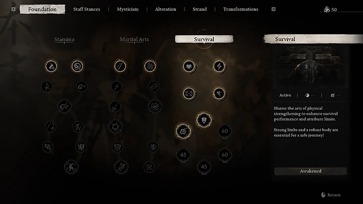 Открытие подменю «Self-Advancement» (Саморазвитие) в главном меню предоставляет доступ к вкладке «Foundation» (Основание), где можно улучшить базовые характеристики. В категории «Survival» (Выживание) находятся навыки «Sturdy Physique» (Крепкое телосложение) и «Unbridled Vigor» (Необузданная энергия), повышающие соответственно здоровье и выносливость. Каждый из них можно улучшить 6 раз. На 30 уровне в той же категории открывается навык «Spiritual Awakening» (Духовное пробуждение), увеличивающий максимальный запас маны.