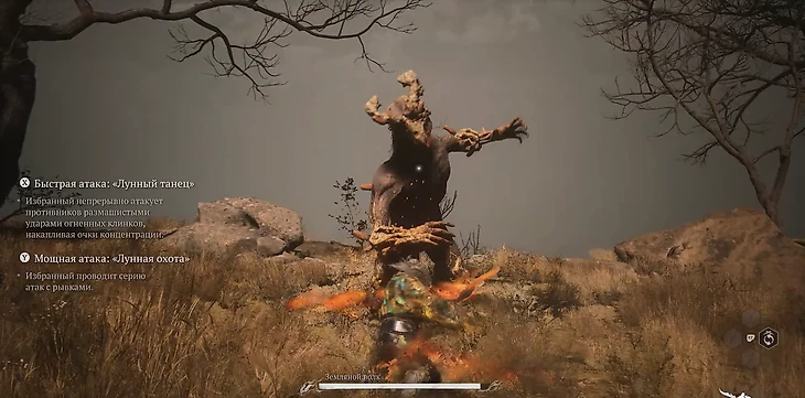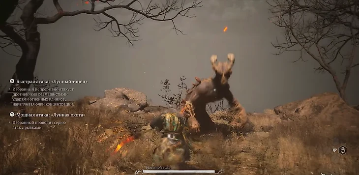 Также Земляной волк может выполнить быстрый прыжок с ближней дистанции, чтобы приземлиться на вас. Если вам удастся уклониться от такого вида атаки, вы получите драгоценное время для нанесения урона. Однако если волк все-таки сможет удачно провести атаку, возьмет вас в захват и подбросит в воздух, вы получите много урона. Старайтесь следить за его лапами и уклоняться от подобных атак.