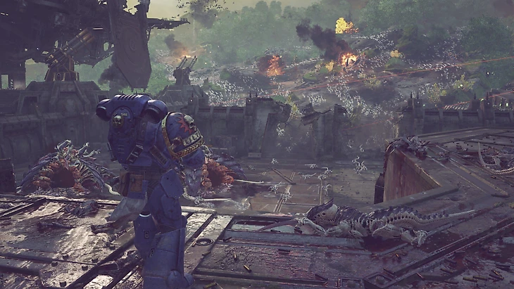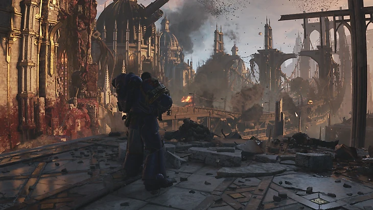 Временами Тита закидывают в серые лаборатории, но в основном уровни роскошно выглядят. На фоне прекрасные соборы, в которые влетела пара разрушительных снарядов. Все окутано дымом и пламенем. Величественный мост, кричащий о величии Империума, вот-вот развалится. По небу роятся тираниды и через пару мгновений сожрут горстку несчастных солдат.