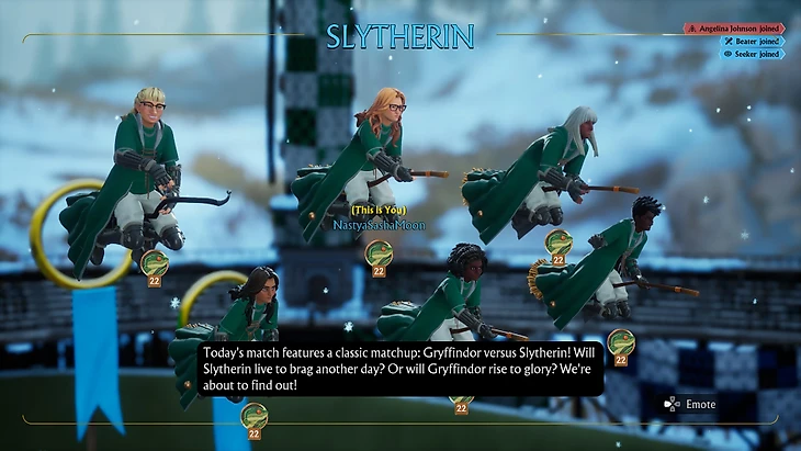 В основе геймплея Quidditch Champions упрощенные правила книжного квиддича. В матчах участвуют две команды по шесть игроков: три охотника, по одному загонщику, вратарю и ловцу. У каждого амплуа свои уникальные задачи на поле, и, соответственно, геймплей за каждую из ролей немного отличается. Например, охотники должны забивать мяч-квоффл в кольца соперников, а загонщики наносят урон оппонентам, запуская в них другие специальные мячи – бладжеры. Матчи длятся по 7 минут или до того момента, пока одна команда не наберет 100 очков. Забитый квоффл дает 10 очков, а пойманный снитч – 30 очков (в книге ловля снитча давала 150 очков). При этом мячик с крылышками появляется не сразу, а на второй и пятой минутах матча (если к этому моменту он не был пойман).