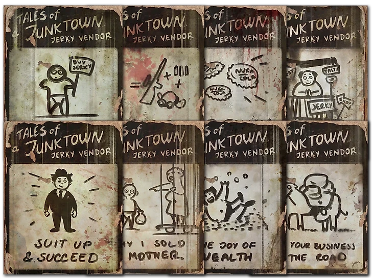 8 журналов «Байки торговца из Джанктауна», расположенных на территории Содружества, рассказывают читателям о том, как правильно торговаться. Каждый экземпляр снижает цены у торговцев на 3%, а если собрать все журналы, то общая скидка составит примерно 20% на все виды товаров.