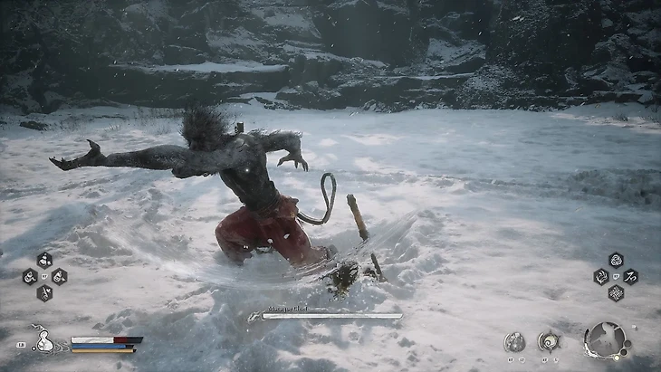 Еще одна опасная комбинация начинается с того, что Вождь обезьян хватает меч ногой и запрыгивает на его рукоять. Затем следует быстрый перекат по земле с вихревым ударом меча и финальный удар сверху вниз. Во время этой атаки важно не переусердствовать с собственными ударами, чтобы не обездвижить противника перед второй частью комбинации.