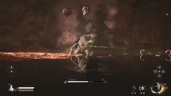 Если Безумный тигр после рева будет держать свои кулаки в земле, это знак, что он пошлет на вас ливень из камней после нескольких приседаний. Также иногда он поднимает гигантский камень, но вместо того, чтобы бросить его в вас, прыгает в вашу сторону через всю арену, чтобы отправить его вам в лицо. Этот удар может нанести большое количество урона, поэтому старайтесь избежать этого.