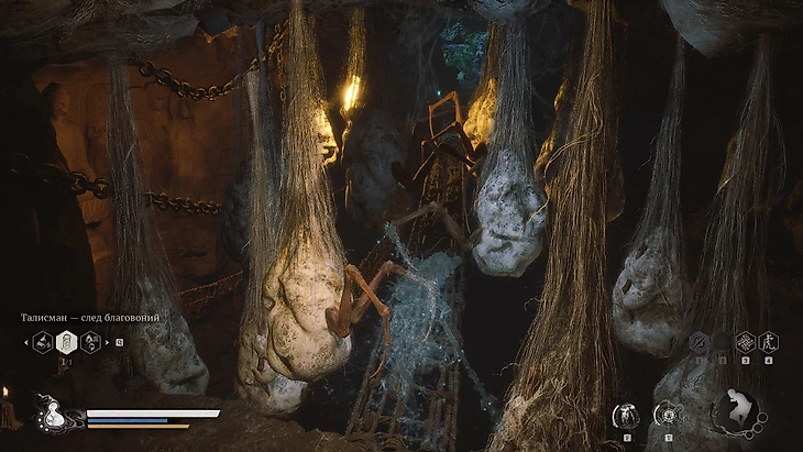 Справа будет проход, закрытый паутиной. Спрыгивайте туда.