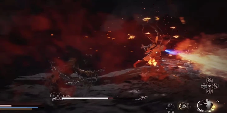 Red Boy активно использует свой посох в ближнем бою, выполняя различные комбинации, некоторые из которых завершаются огненными полосами. Внимательно наблюдайте за его движениями и будьте готовы уклоняться или блокировать атаки.