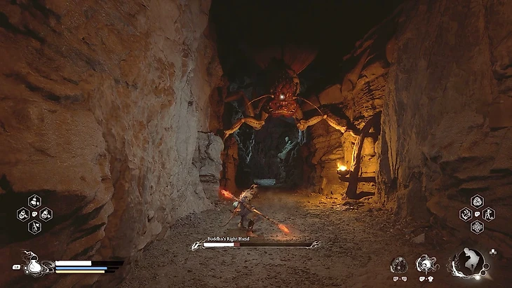 Один из таких боссов – Правая рука Будды (или Buddha’s right hand). Бой с ним состоится в четвертой главе Black Myth Wukong. Босс располагается в средней части Паутинной лощины. Сражение с ним обязательно для того, чтобы пройти дальше – в Нижнюю лощину.