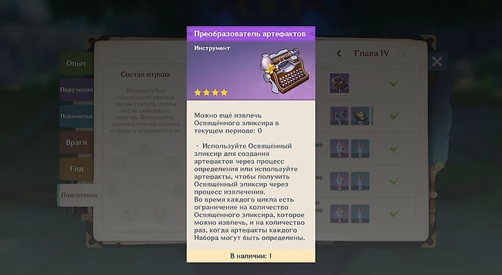 Один из самых простых способов – перекрафтить из старых артефактов. Это можно сделать из меню предмета «Преобразователь артефактов», который выдается за сбор 25 легендарных артефактов. Он станет доступен в Руководстве искателя приключений, во вкладке «Подготовка»: