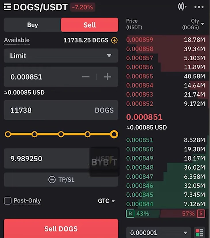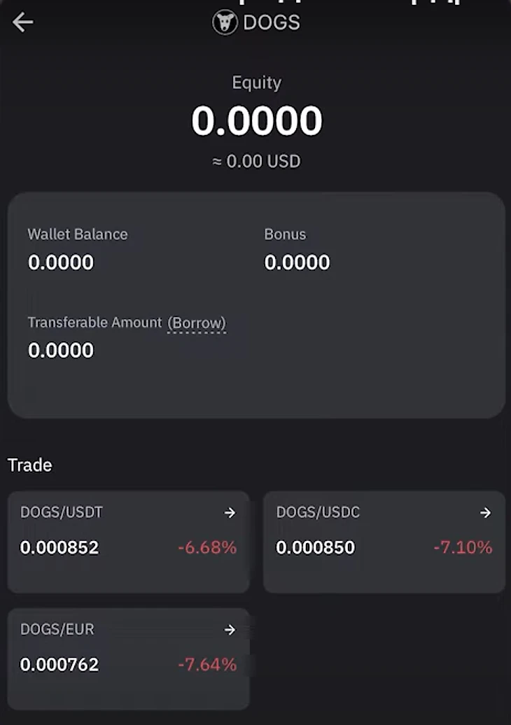 Пока токен Hamster Kombat недоступен на бирже, поэтому приведем пример на $DOGS. С $HMSTR все то же самое. Ищем нужный нам токен в списке криптовалют, после чего в разделе Trade нажимаем на нужный нам курс, в данном случае это DOGS/USDT.