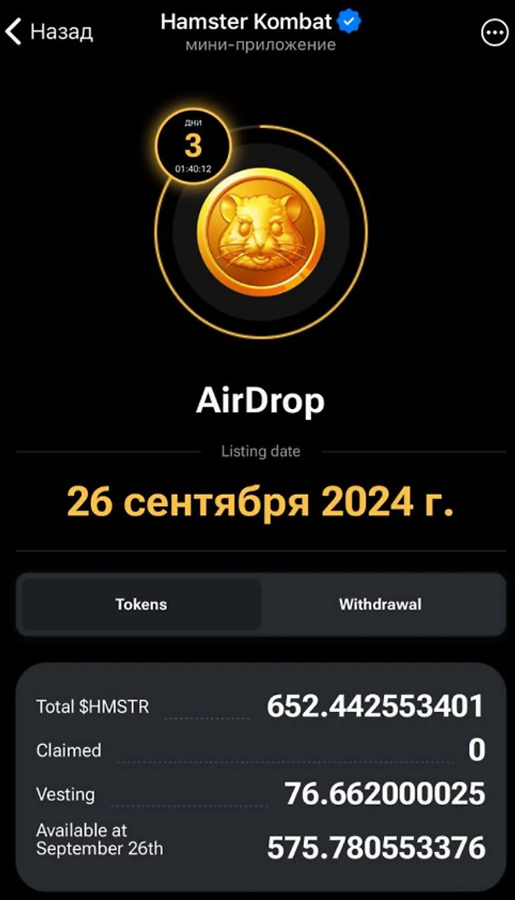 22 сентября в Hamster Kombat прошел аирдроп, и разработчики раздали игрокам токены. 26 сентября деньги с «Хомяка» можно будет вывести – рассказываем, как это сделать.