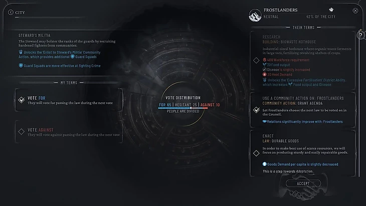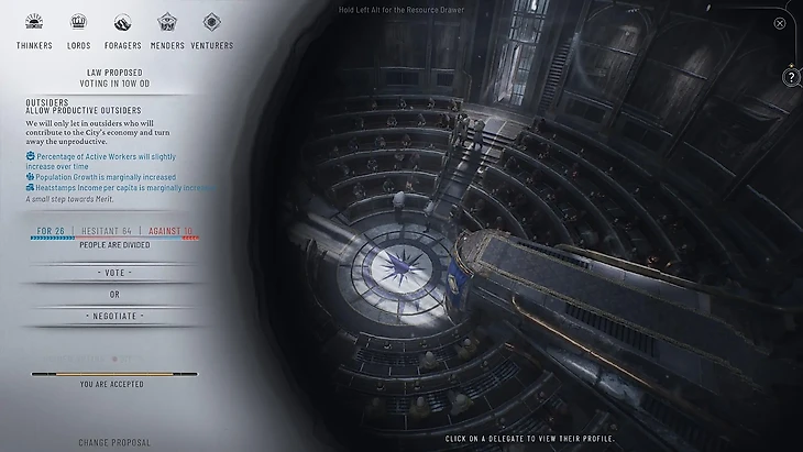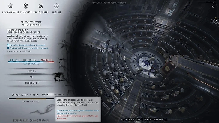 Каждая фракция имеет свою повестку, которая может включать или не включать поддержку необходимых вам законов. Фракции могут быть либо за, либо против закона, а нерешительные могут остаться нейтральными. Поэтому вам нужно будет вести переговоры с нерешительными, чтобы склонить их на свою сторону. Условия, выдвигаемые различными фракциями, могут варьироваться от строительства специфических сооружений до принятия определенных законов или даже проведения исследовательских проектов.