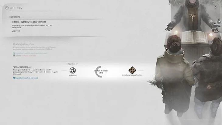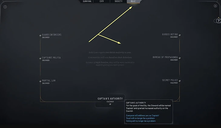 Каждые 10 недель вам предоставляется возможность предложить новый закон. Выберите одну из четырех категорий: выживание, город, общество или правило. Внутри каждой категории будет несколько доступных законов.