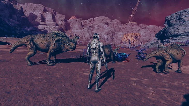 В свободное от болтовни время, мы исследуем новую планету – такую же невзрачную, как и старые. Фиолетовое небо, серые скалы, желтая земля и огромные пустоши, которые разбавляют шаблонные постройки. Даже в местной фауне нет ничего необычного: сплошные жуки из «Звездного десанта» и обычные солдаты, окруженные синим сиянием.