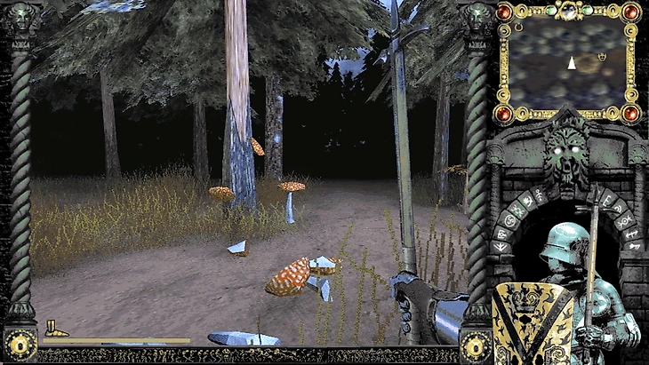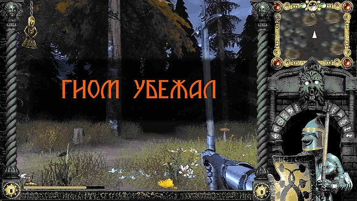 Итак, геймплей. Главный герой – рыцарь пути мести, алчности или благородства. Его задача – выследить гномов в лесу. То, что в ААА-играх называется «элементом RPG», то есть выбранный в начале путь, влияет на реплики персонажей. После слегка непонятного начала (после знакомства с персонажем и получения амулета нужно бесцельно бегать пару минут и бить грибы) появляется первый гном, а дальше – дело техники. Только гномы носятся шустрее Шумахера в лучшие годы, а рыцарь в полном боевом облачении едва поспевает за ними. В гоночных симуляторах порой ботов делают такими, чтобы игрок мог догнать их только к концу гонки, а тут совсем не так – я видела переиначенный экран из Dark Souls чаще, чем в Dark Souls.
