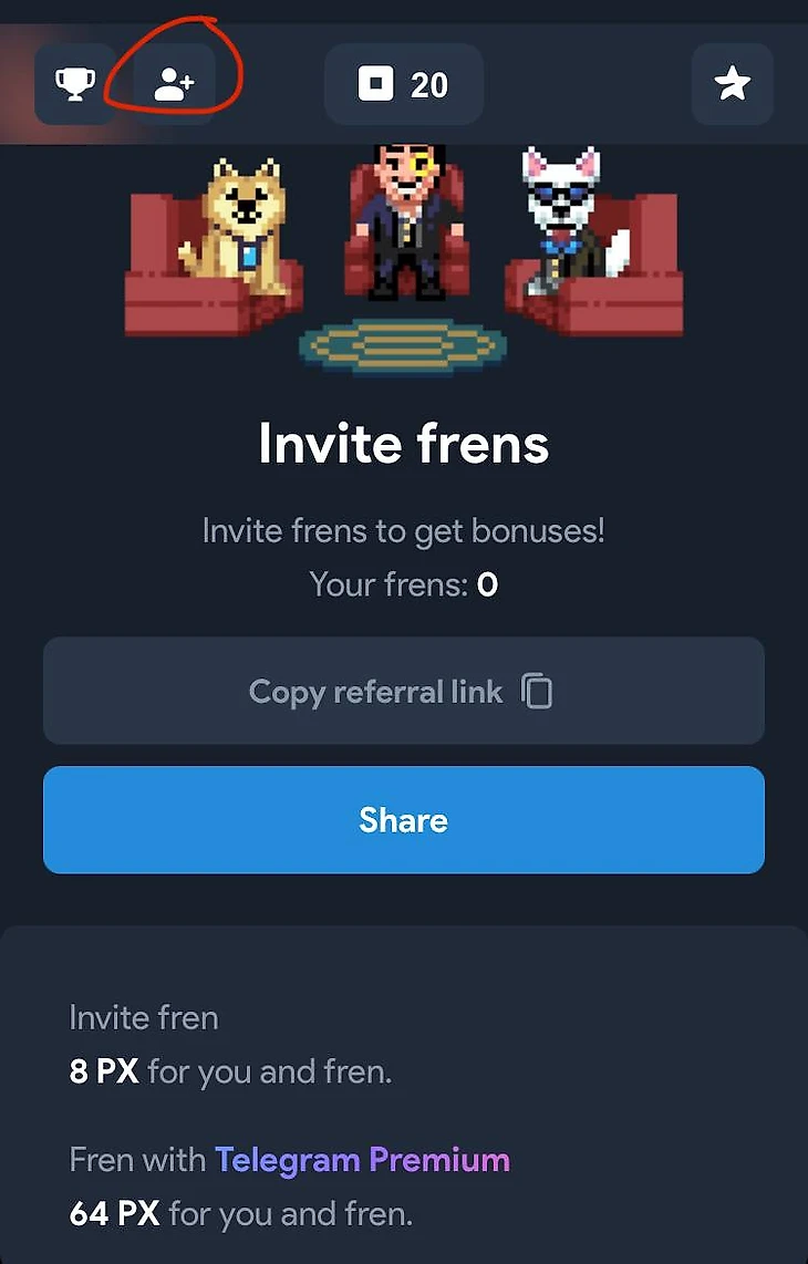 Чтобы пригласить друга, отправьте ему свою реферальную ссылку. За каждого приглашенного друга вы получите 8 $PX, а если у него есть Telegram Premium, то в 8 раз больше – целых 64 $PX.
