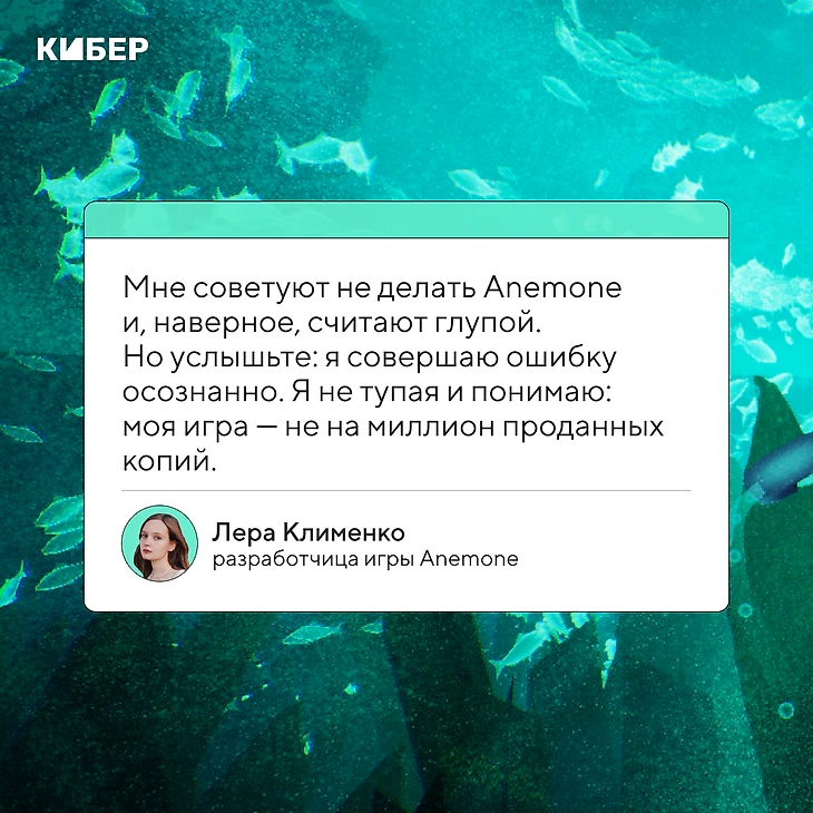 «Мне советуют не делать Anemone и, наверное, считают глупой. Но услышьте: я совершаю ошибку осознанно. Я не тупая и понимаю: моя игра – не на миллион проданных копий. Вы переживаете за меня и за потенциальный провал. Спасибо, но я знаю, что делаю».