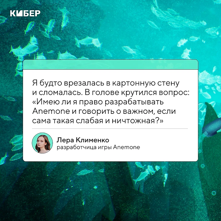 «Я столкнулась с личными проблемами, о которых не хочу говорить. Я будто врезалась в картонную стену и сломалась: много месяцев не выходила из дома, ничего не делала. В голове крутился вопрос: «Имею ли я право разрабатывать Anemone и говорить о важном, если сама такая слабая и ничтожная?»