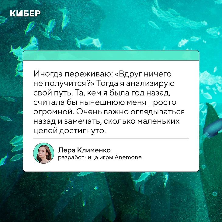 Я встретил Леру Клименко, разработчицу игры Anemone, у входа в офис Кибера. Она отлично выглядела: красивая, стильно одетая и очаровательно виноватая за задержку на жалкие десять минут. Уже в лифте мы разговорились – о погоде, общих знакомых и плюсах жизни вдали от центра столицы.