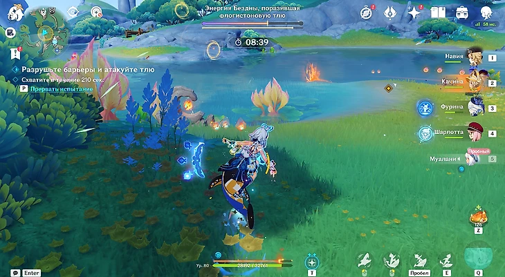 На этот раз среди пробных персонажей есть Муалани. Ее навык позволяет серфить, поэтому полезно будет поддерживать полоску флогистона заполненной. На карте найдется немало флогистоновых частиц – не пренебрегайте ими.