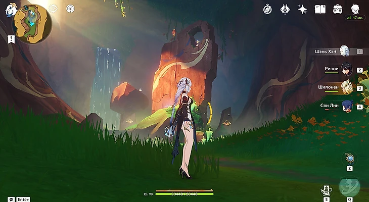 Возьмите в отряд Гео персонажа для удобства и разбейте камень. Можно заранее зачистить всех врагов в округе – включая тех, что охраняют удивительный сундук ниже этого озера. Позже все равно придется туда идти.