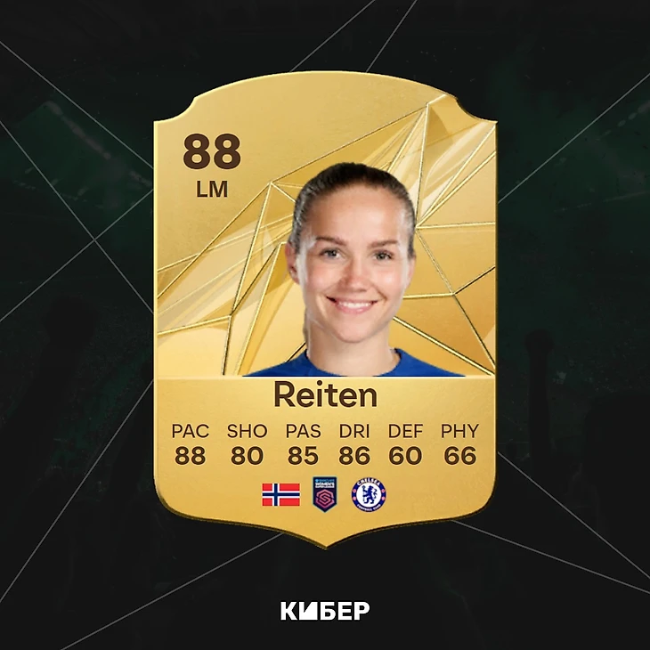 Переходим к атаке. Здесь отличную универсальную карточку получила Гуро Рейтен из «Челси». Она хороша на левом фланге и под нападающими, практически не устает (выносливость – 91) и феноменально навешивает (93). При удачном случае норвежка всегда готова завершить атаку точными ударами.