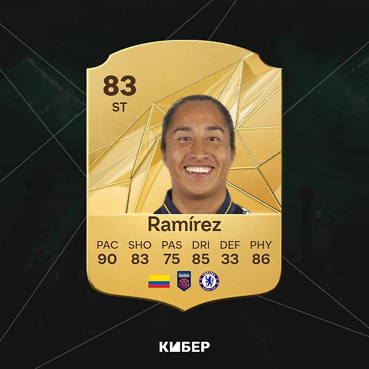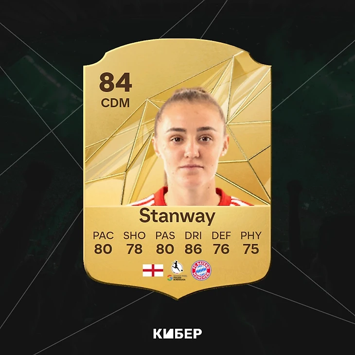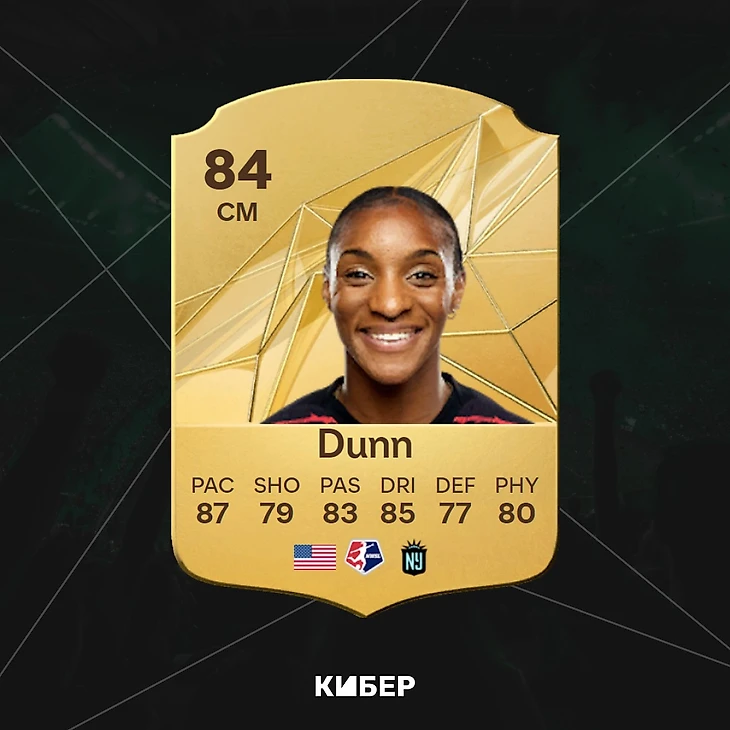 Быстрые карточки в центре поля – редкость. В FC 25 щедрую скорость рассчитали Кристал Данн, которая также играет на двух флангах. К феноменальной скорости (87) добавились солидные навыки защиты (77) и ударов (79). Данн умеет все, кроме штрафных (68) и игры головой (54).