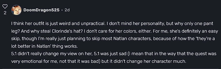 «Я думаю, что ее наряд странный и непрактичный. Я не против такого выражения индивидуальности, но почему одна штанина? И зачем она украла шляпу у Клоринды? Меня не волнуют ее цвета. Я пропущу ее баннер не задумываясь, при этом не планирую крутить большинство персонажей Натлана из-за механики «лучше играть этим героем в Натлане». Патч 5.1 не сильно изменил мое мнение насчет нее, он был просто грустным (не плохой, просто я не прочувствовал эмоции), но это событие не изменило характер ее персонажа».