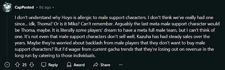 «Я не понимаю, почему у HoYo аллергия на парней-саппортов. У нас давно не было таких... начиная с Томы? (Кибер: вышел в ноябре 2021 года) Или Мики? (Кибер: вышел в марте 2023 года). Я не помню. Возможно, метовым саппортом-парнем был Тома. Это буквально мечта некоторых игроков, собрать команду из высоких парней, но я даже думать об этом не могу. Дело даже не в том, что парни-саппорты плохо продаются: баннер Кадзухи стабильно получает прибыль на протяжении многих лет. Может быть, их волнует негативная реакция игроков-мужчин, потому что те не хотят покупать парней-саппортов? Но, судя по текущим тенденциям в гаче, я готов поспорить, что они теряют прибыль в долгосрочной перспективе, обслуживая таких людей».