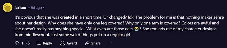 «Очевидно, что на ее создание потратили слишком мало времени. Или ее меняли? Я не знаю. Для меня проблема в том, что каждая часть ее дизайна не имеет смысла. Почему у нее прикрыта только одна рука и нога? Цвета ужасные, у нее нет ничего особенного. Что не так с эльфийскими ушами? Она напоминает мне персонажей, которых я рисовал в средней школе. Просто какие-то странные шмотки на самой обычной девушке».