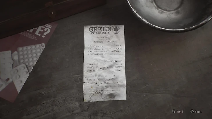 Чек на лекарства на первый взгляд кажется подсказкой к разгадке какой-то головоломки в восточной части Южной Долины. Однако, как выясняется при дальнейшем прохождении, он является просто частью фонового лора игры. Его значение не так просто понять, особенно если игрок не знаком с главным сюжетным поворотом Silent Hill 2. Лекарства, перечисленные в чеке, вымышлены, но, как заметил один из пользователей Reddit, их названия напоминают реально существующие препараты, используемые для лечения рака и тревожных расстройств. Это может быть тонким намеком на состояние здоровья Мэри, жены главного героя Джеймса, которая страдала от неизлечимой болезни.