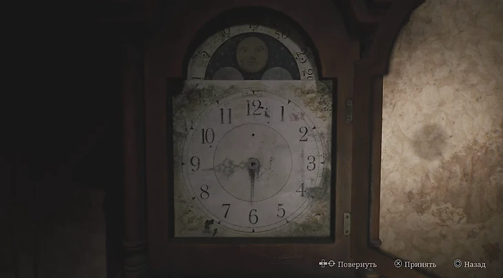 Осмотрите дыру в стене, чтобы найти там секундную стрелку, после чего вернитесь в комнату с часами и установите ее на 3 часа (вправо).
