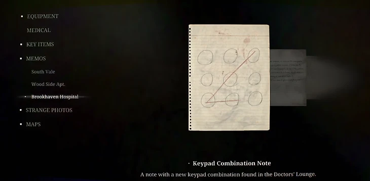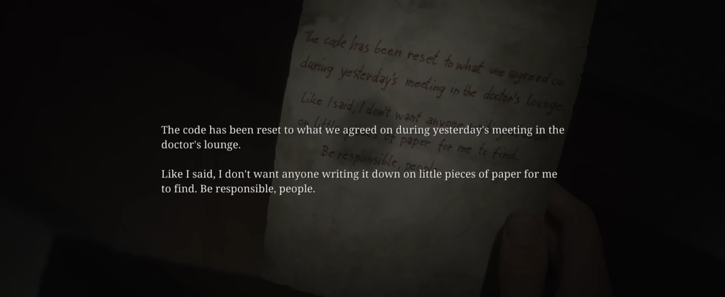 В ходе преследования Лоры по лабиринтам больницы Брукхейвен в ремейке Silent Hill 2 игрокам предстоит исследовать многочисленные этажи и подвал этого зловещего места. В больнице много запертых дверей и запутанных головоломок. Одна из таких головоломок – замок на панели медпункта, расположенного на втором этаже. Код от него спрятан в недрах больницы, а его поиск – сам по себе небольшое испытание. Местоположение кода и его значение варьируются в зависимости от выбранного уровня сложности игры.