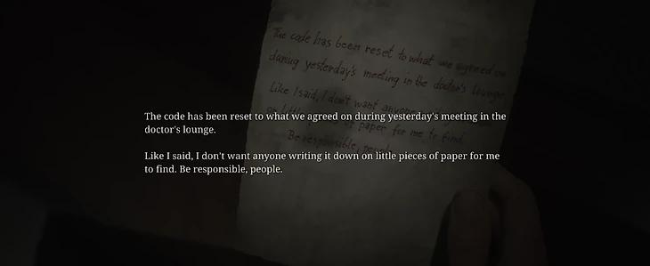 Записка содержит комбинацию цифр, необходимую для открытия кодовой панели поста медсестер: 3578 для легкого и стандартного уровней сложности, 7456 для жесткого уровня сложности.