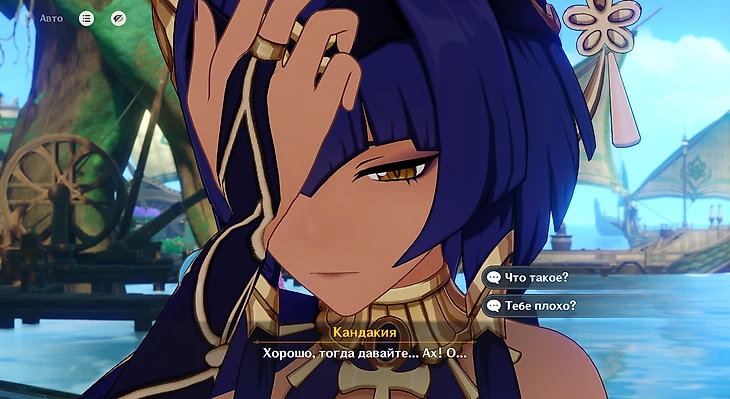 Когда все разойдутся по своим делам, следуйте за Кандакией и пройдитесь с ней по рынку. Девушку мучают видения, что позволяют видеть будущие события. Она признается, что до сегодняшнего дня не сталкивалась с подобным, и показывает возможную причину изменений – странный самоцвет, который купила этим утром.