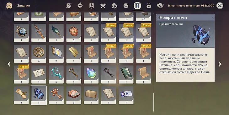 Нефрит ночи разбит на 3 осколка и появится в инвентаре автоматически, когда вы соберете все. Вы получите их в сундуках Натлана за прохождение некоторых заданий и решение головоломок.
