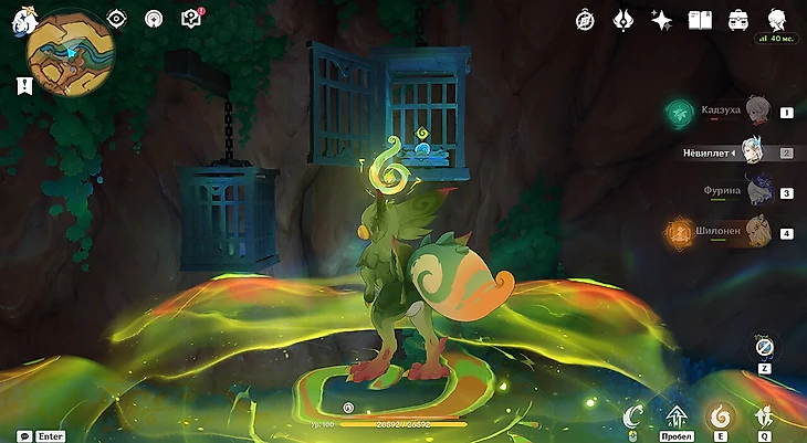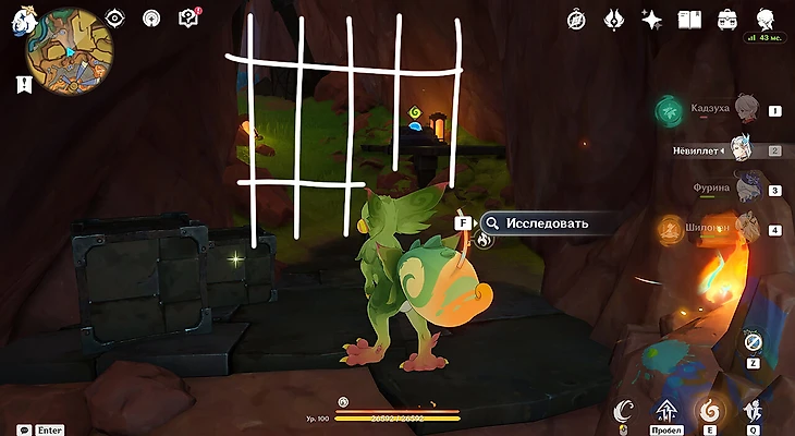 Исследовательский центр находится под землей, неподалеку от подземелья талантов «Огненные руины». Если вы пойдете по тропинке, то обнаружите множество Фатуи, охраняющих вход, и заврианов в клетках. Зачистите все наверху и продвигайтесь вниз.
