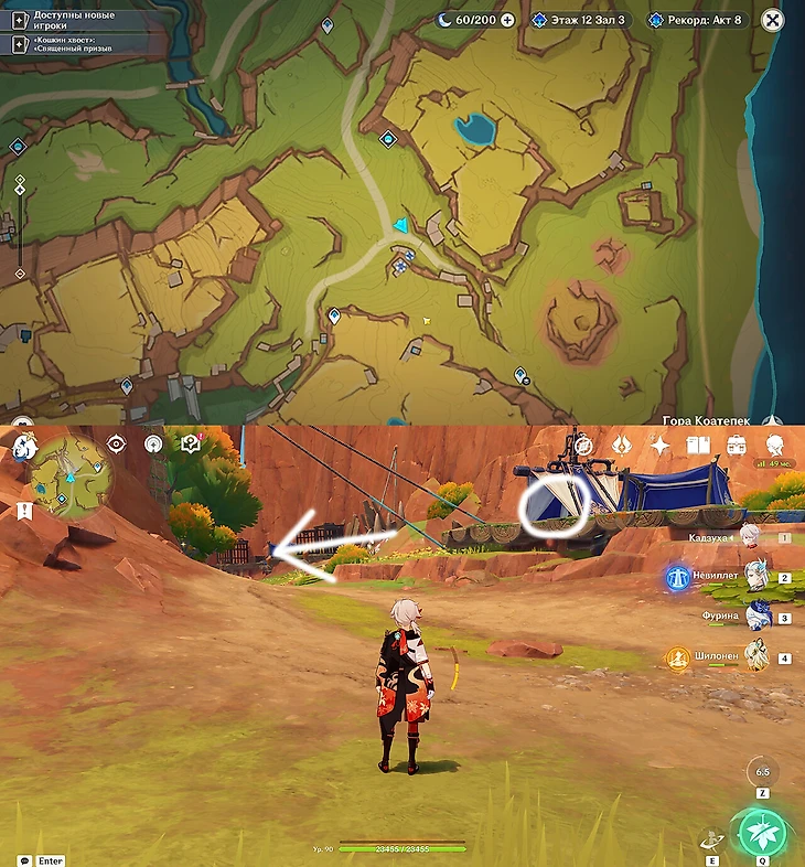 Снова зачистите всех Фатуи, чтобы прыжок здоровяка не откинул вас в лаву при решении головоломок. В награду будут обычный и удивительный сундуки, но нужный сундук с ключом с насечками по центру находится в богатом сундуке – отмечен белым кругом на скриншоте. Стрелка указывает на телегу с драгоценным сундуком, которую можно открыть этим ключом.