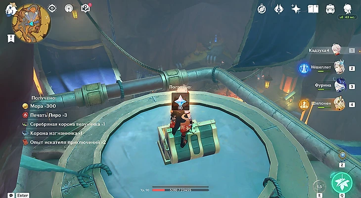 В завершение вы получите роскошный сундук, в котором лежит ключ с насечками сзади и осколок нефрита ночи. Также вы получите достижение «Праведное сопротивление». Все заврианы будут спасены и убегут из клеток. Но не спешите уходить, ведь остались еще сундуки. Во-первых, заберитесь на генератор. Это можно сделать с помощью героев Натлана, которые ловко бегают по стенам, либо с помощью Кадзухи, Странника, Чжун Ли, Гео Путешественника и других персонажей, облегчающих карабканье. Наверху находится драгоценный сундук.